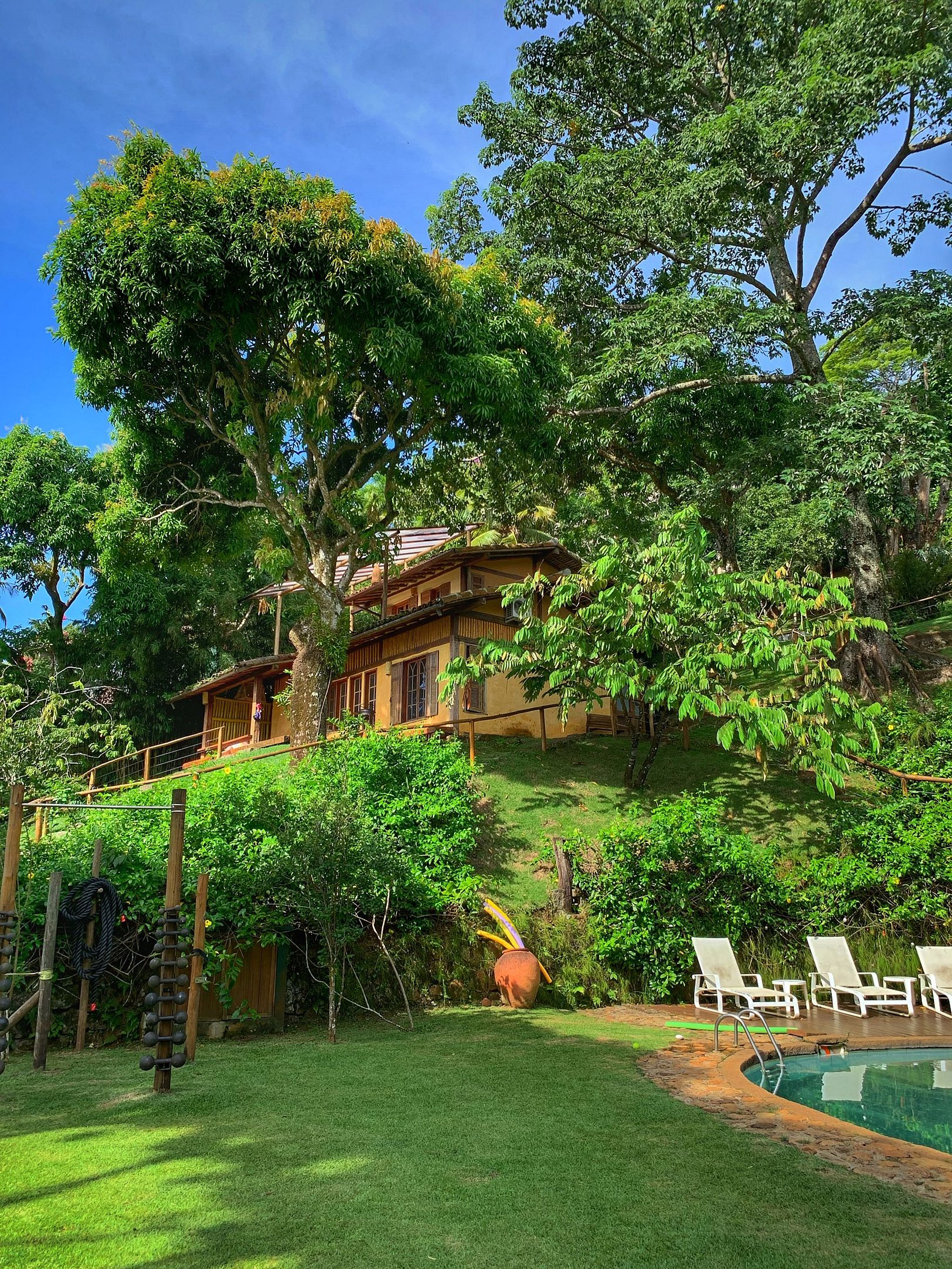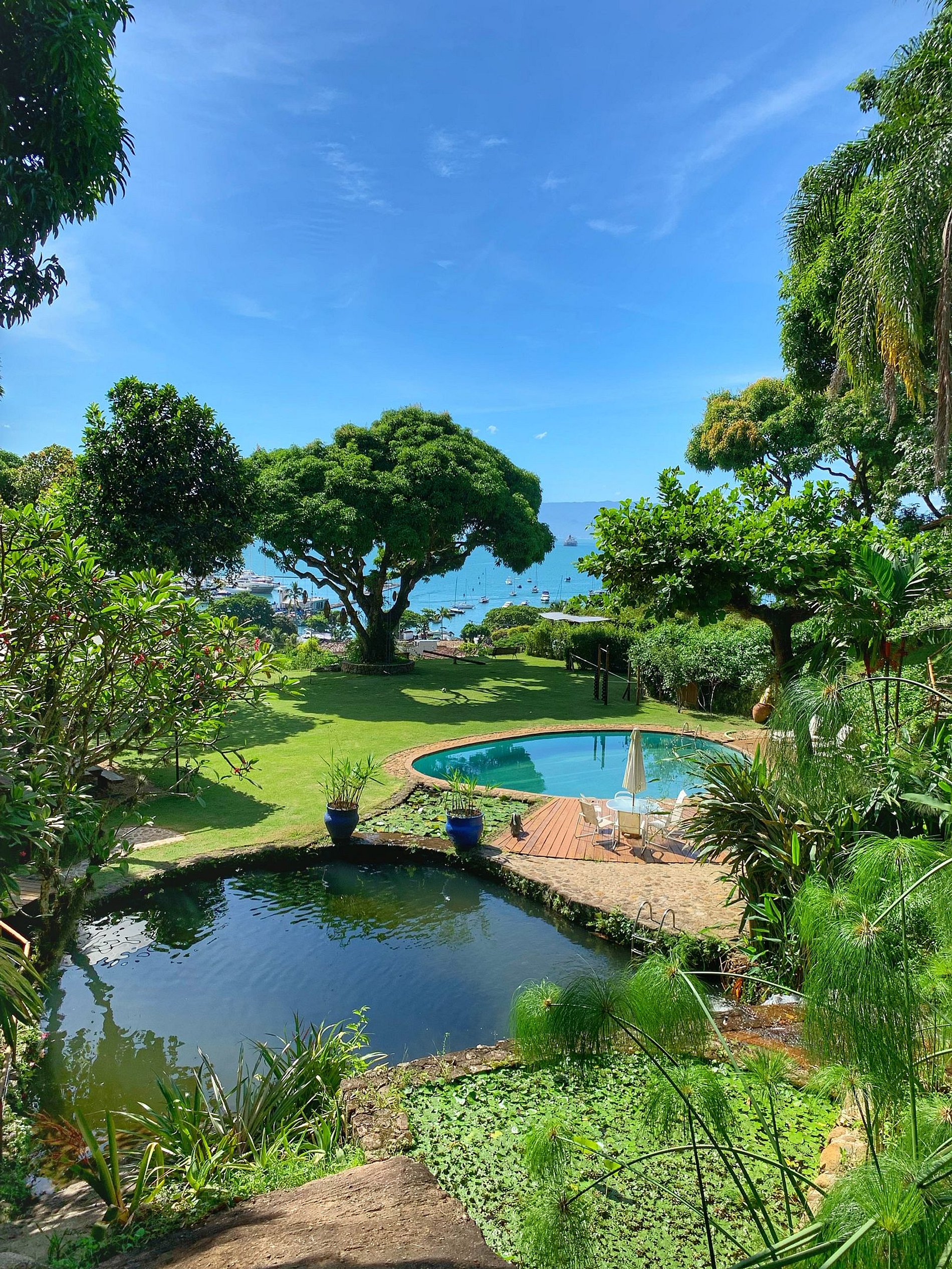 Located 600m from Vila (historic center) and 300m from the nearest beach, Casa Bambu is in a 7,000m² ornamental garden with frontal views of the sea, 4 natural pools with water from the waterfall, as well as one with treated water and stone bottom, complete kiosk, dining tables with splendid views of the sea, gym area, as well as waterfalls spread throughout the property. Here you will find everything you need for unforgettable days of rest and immersion in nature without giving up top-notch comfort and proximity to the city's main attractions!