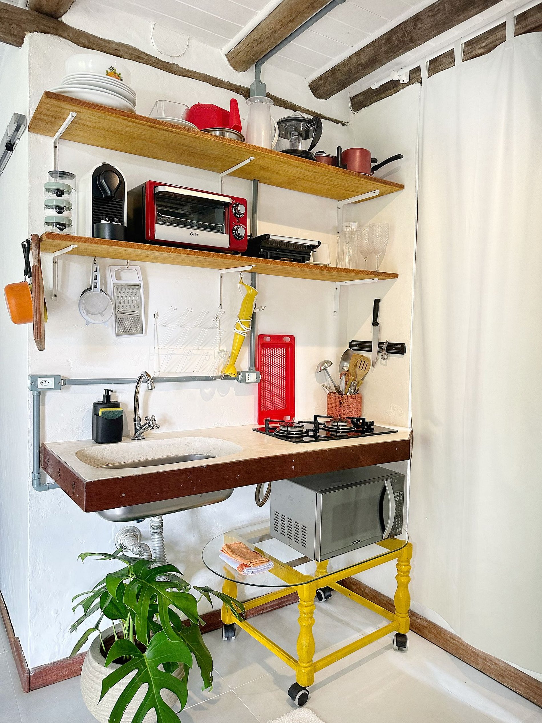 Possui quarto amplo, cozinha completa, banheiro com chuveiro a gás e secador de cabelo, vista para o jardim e vista parcial para o mar, e varanda espaçosa com rede, mesa e cadeiras, de frente para piscina natural, que harmoniza o ambiente com o som das águas! Conta ar condicionado, Smart TV, wifi. A Casa Musa tem acima dela outra casa para casais, ambas com total privacidade.