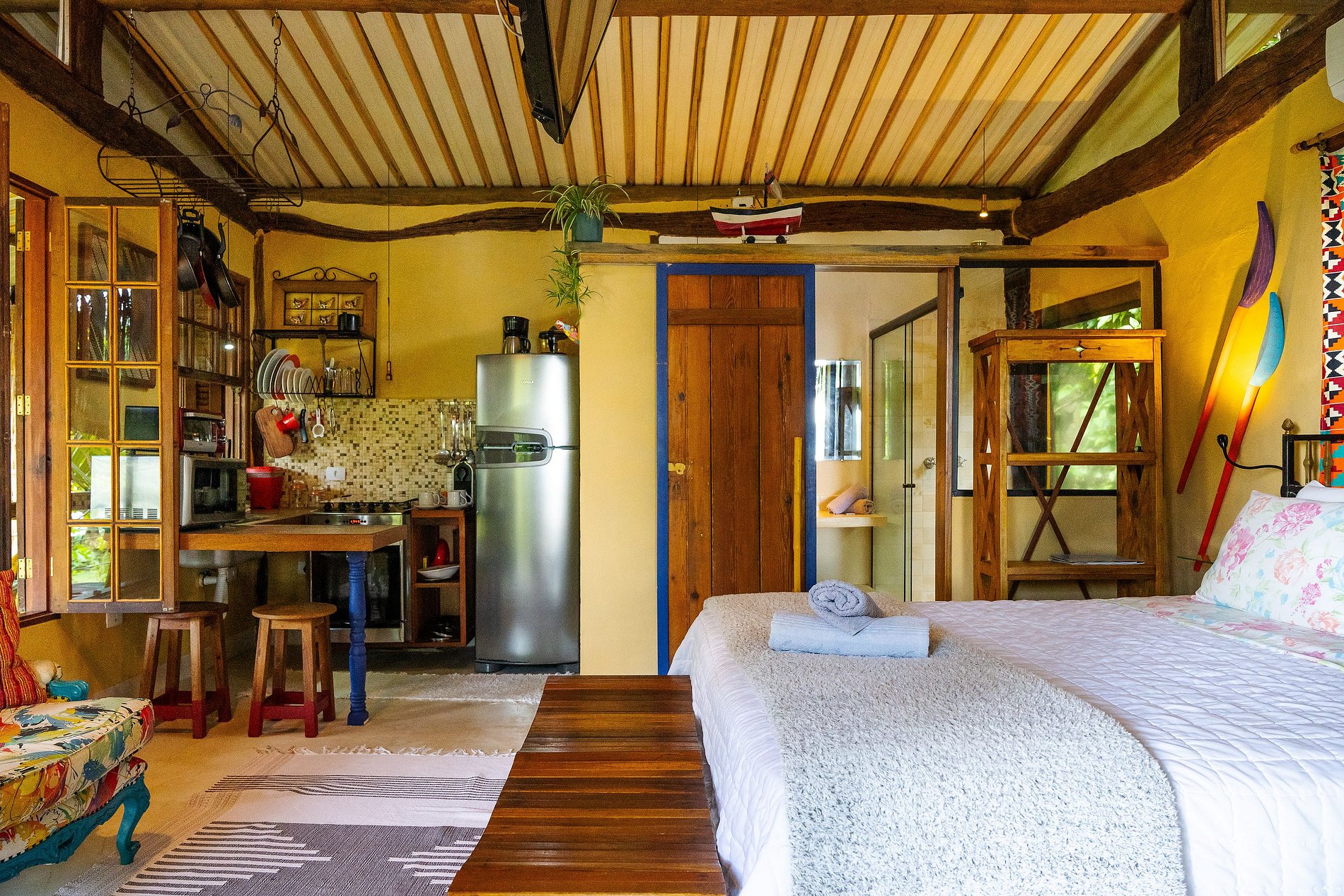 Casa Árvore dispone de un amplio dormitorio con aire acondicionado, Smart TV e internet WiFi, cocina totalmente equipada con todo el menaje necesario para una estancia perfecta, baño con ducha de gas y secador de pelo, y un amplio balcón con una gran mesa y vistas al mar. al jardín ornamental, frente a la piscina natural, que armoniza el ambiente con el sonido del agua!