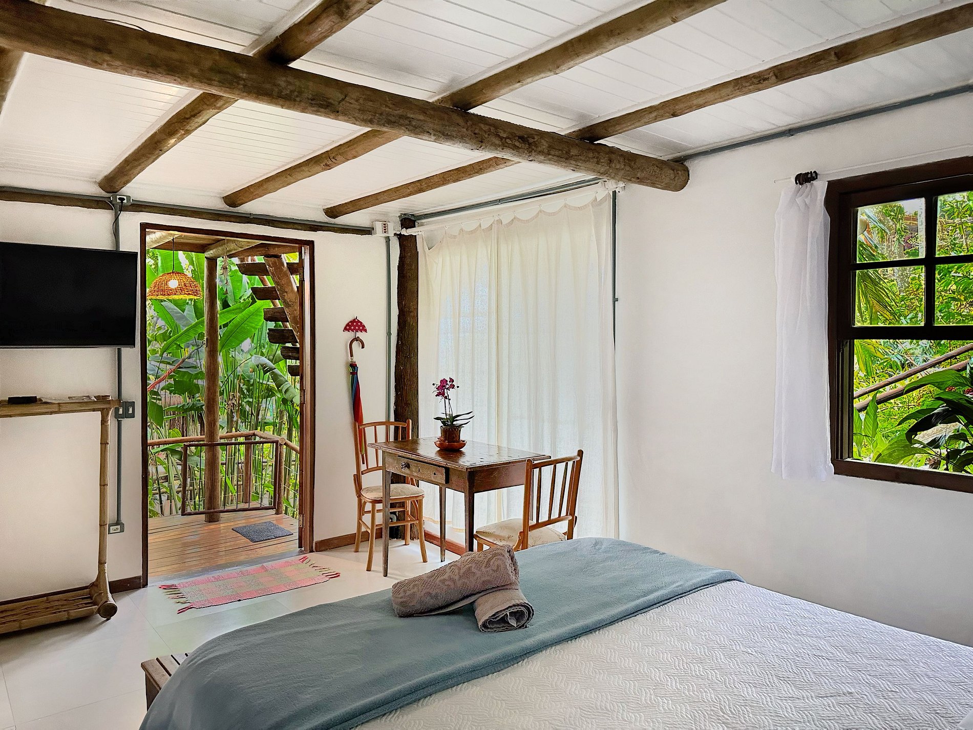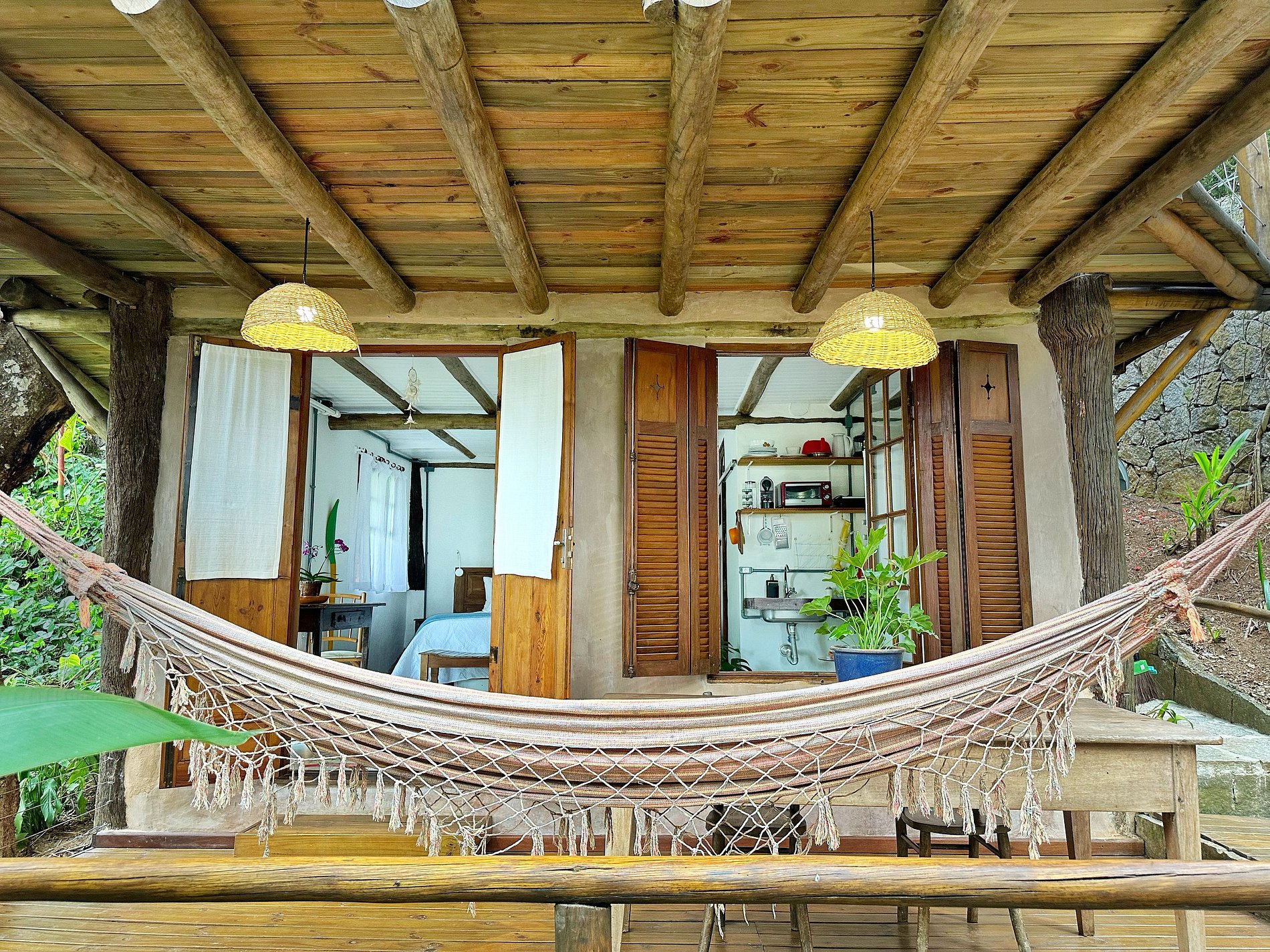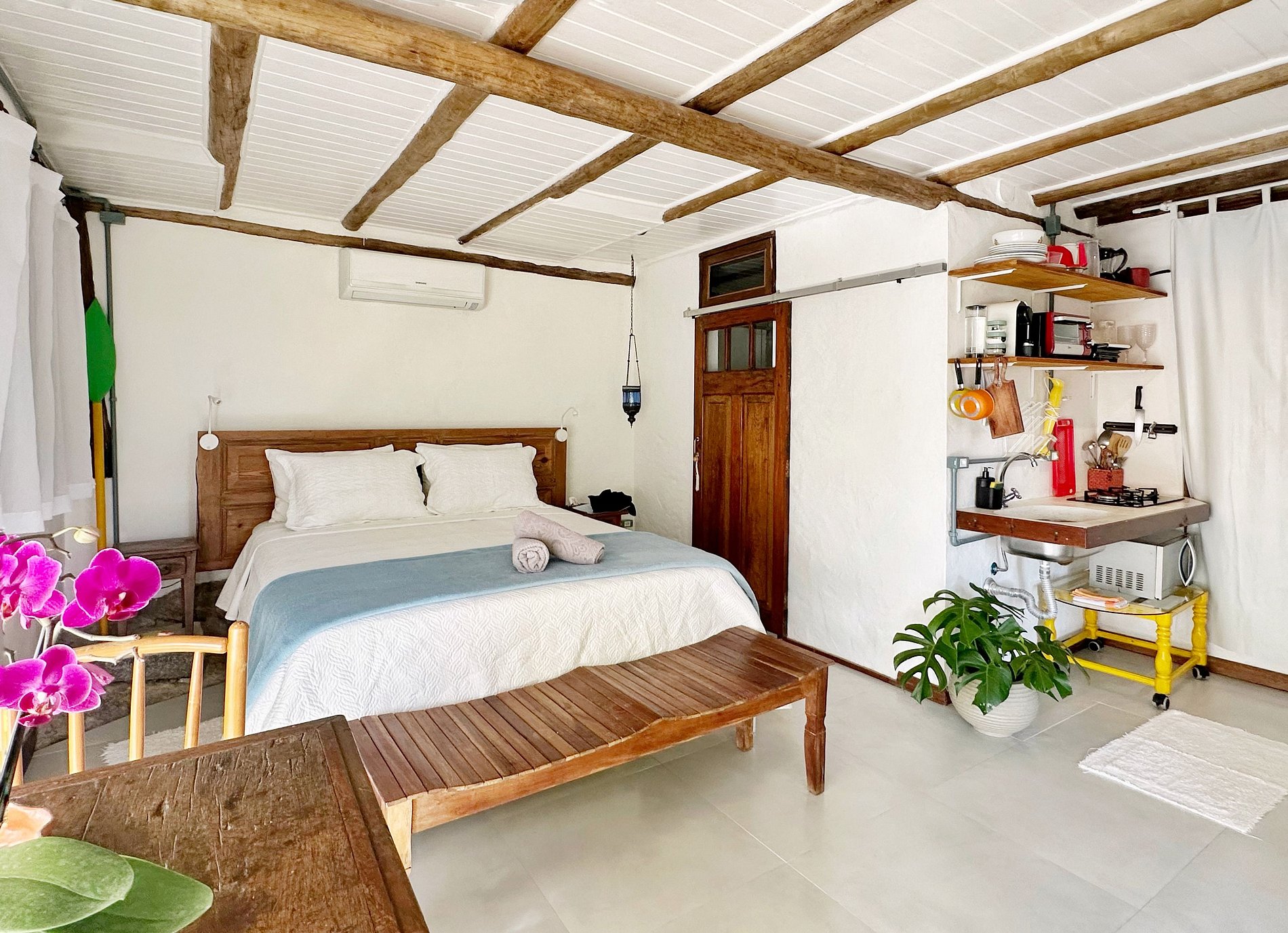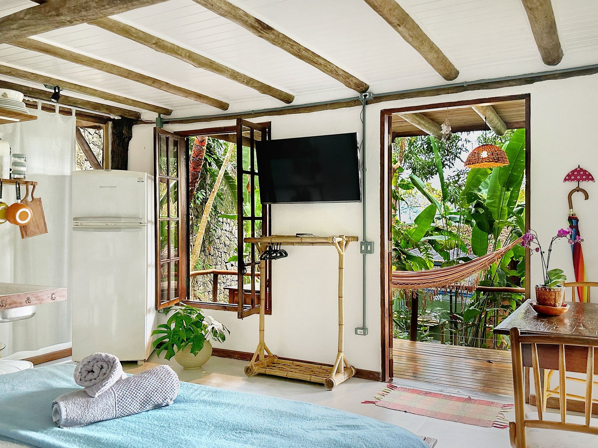 Possui quarto amplo, cozinha completa, banheiro com chuveiro a gás e secador de cabelo, vista para o jardim e vista parcial para o mar, e varanda espaçosa com rede, mesa e cadeiras, de frente para piscina natural, que harmoniza o ambiente com o som das águas! Conta ar condicionado, Smart TV, wifi. A Casa Musa tem acima dela outra casa para casais, ambas com total privacidade.