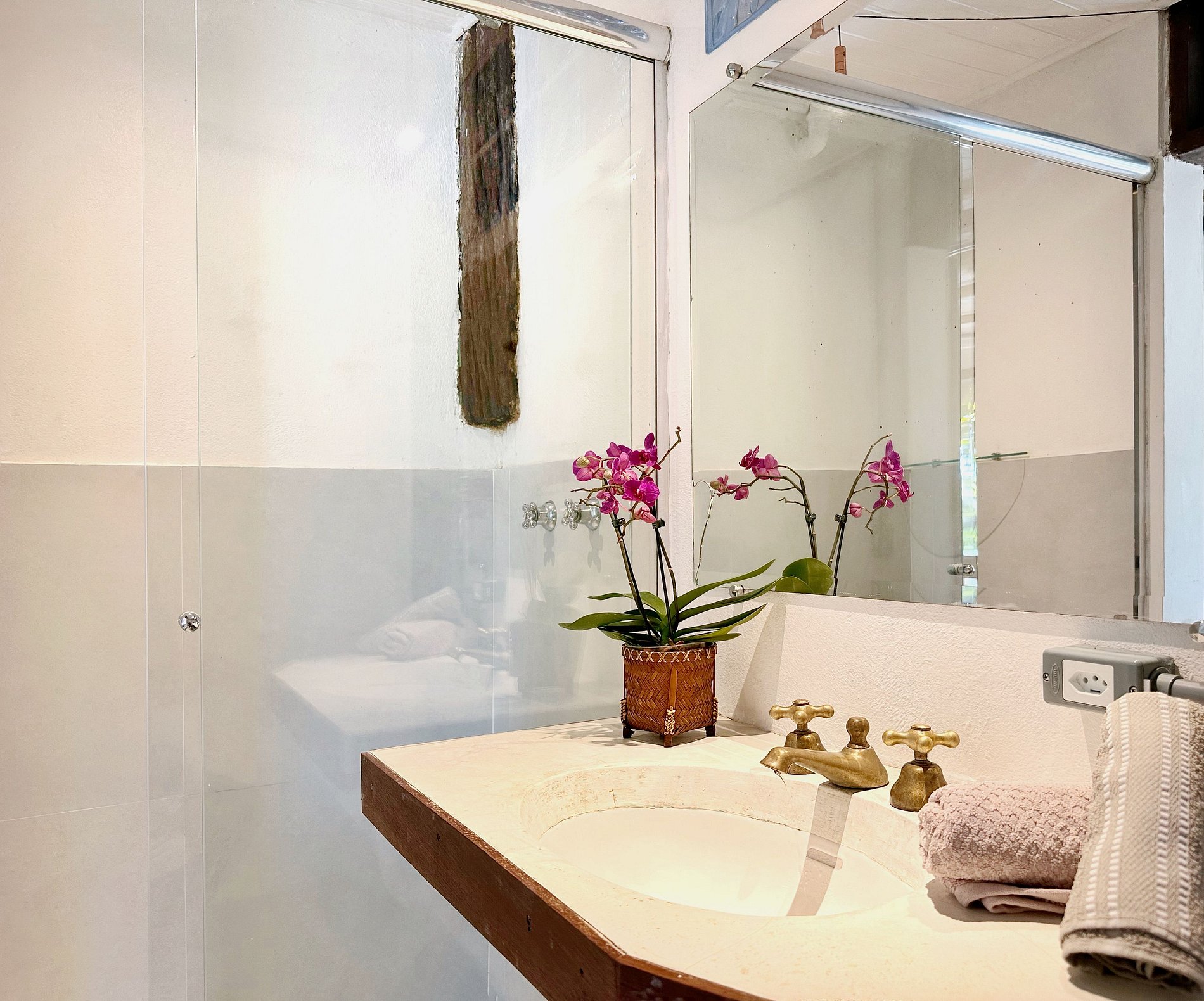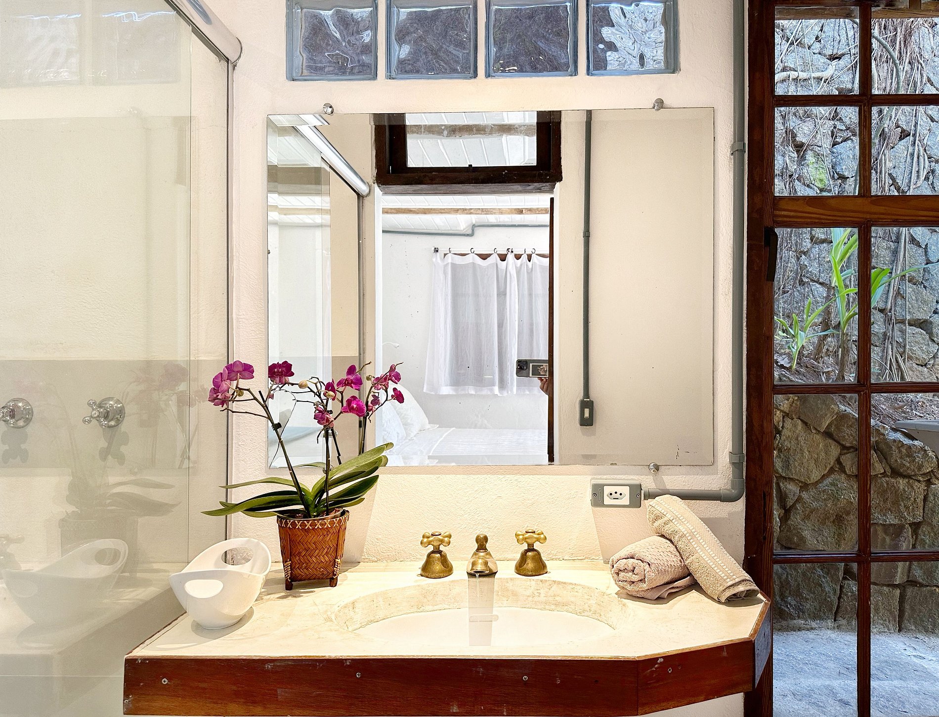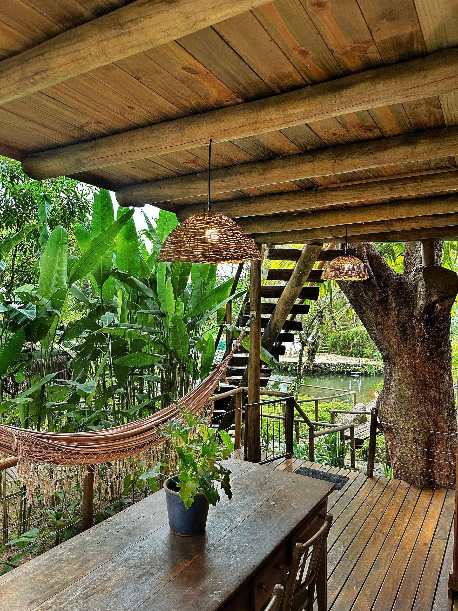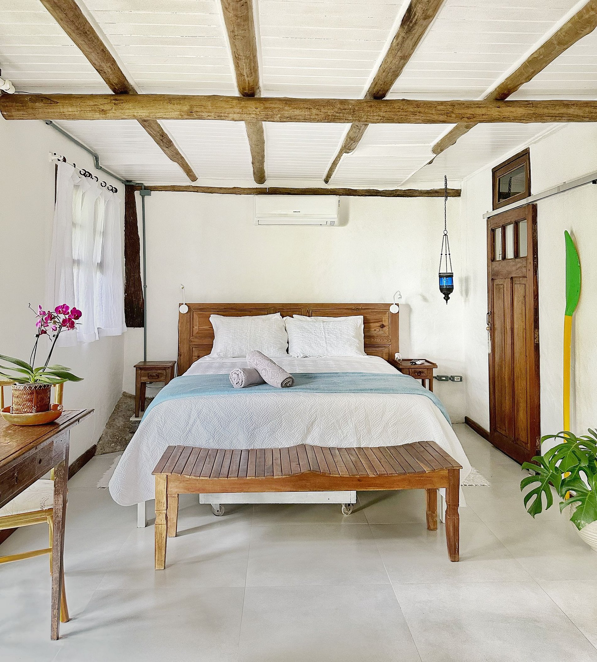 Possui quarto amplo, cozinha completa, banheiro com chuveiro a gás e secador de cabelo, vista para o jardim e vista parcial para o mar, e varanda espaçosa com rede, mesa e cadeiras, de frente para piscina natural, que harmoniza o ambiente com o som das águas! Conta ar condicionado, Smart TV, wifi. A Casa Musa tem acima dela outra casa para casais, ambas com total privacidade.